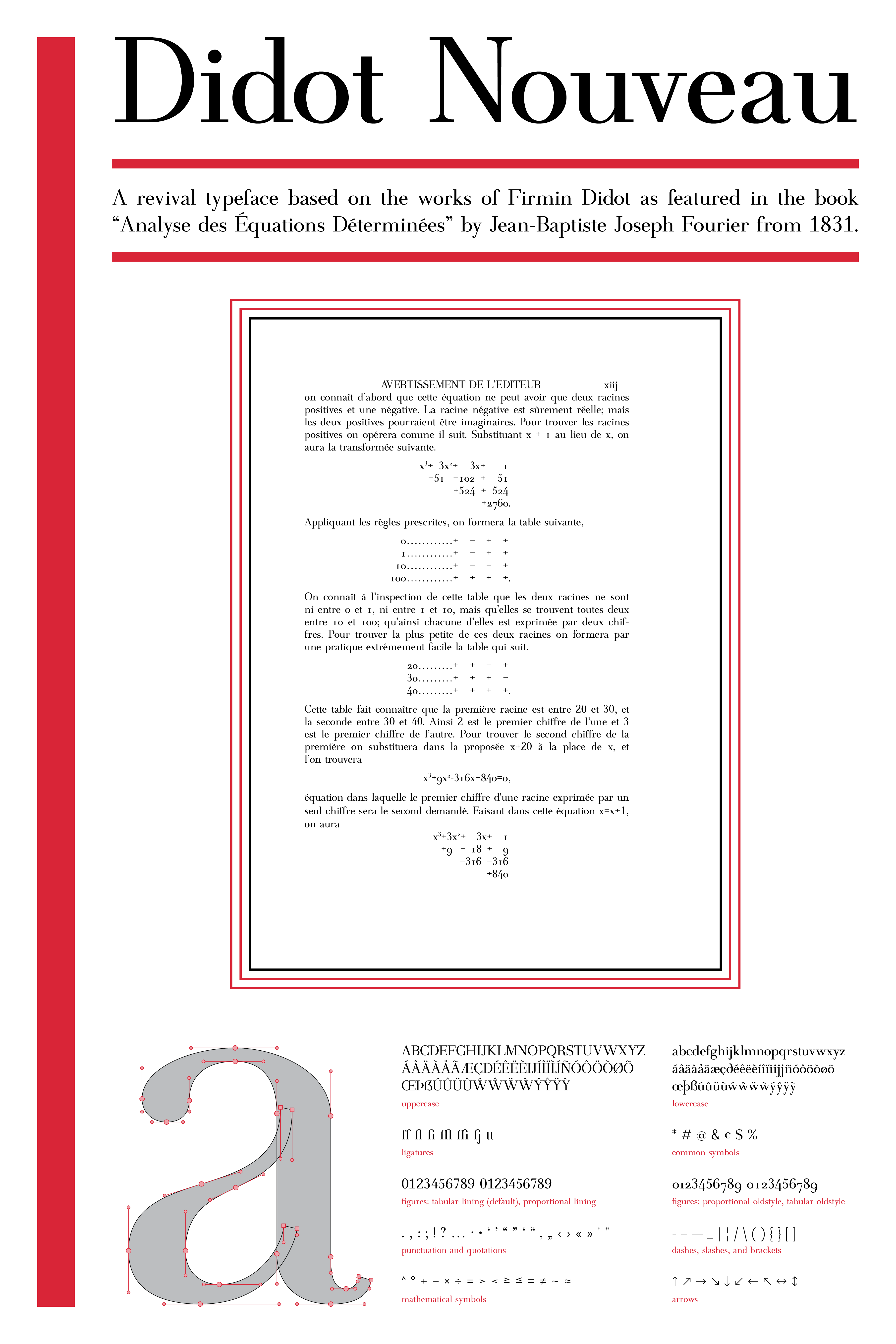 This revival typeface was created based on the works of Didot, as featured in the book "Analyse des Equations Déterminées" from 1831.