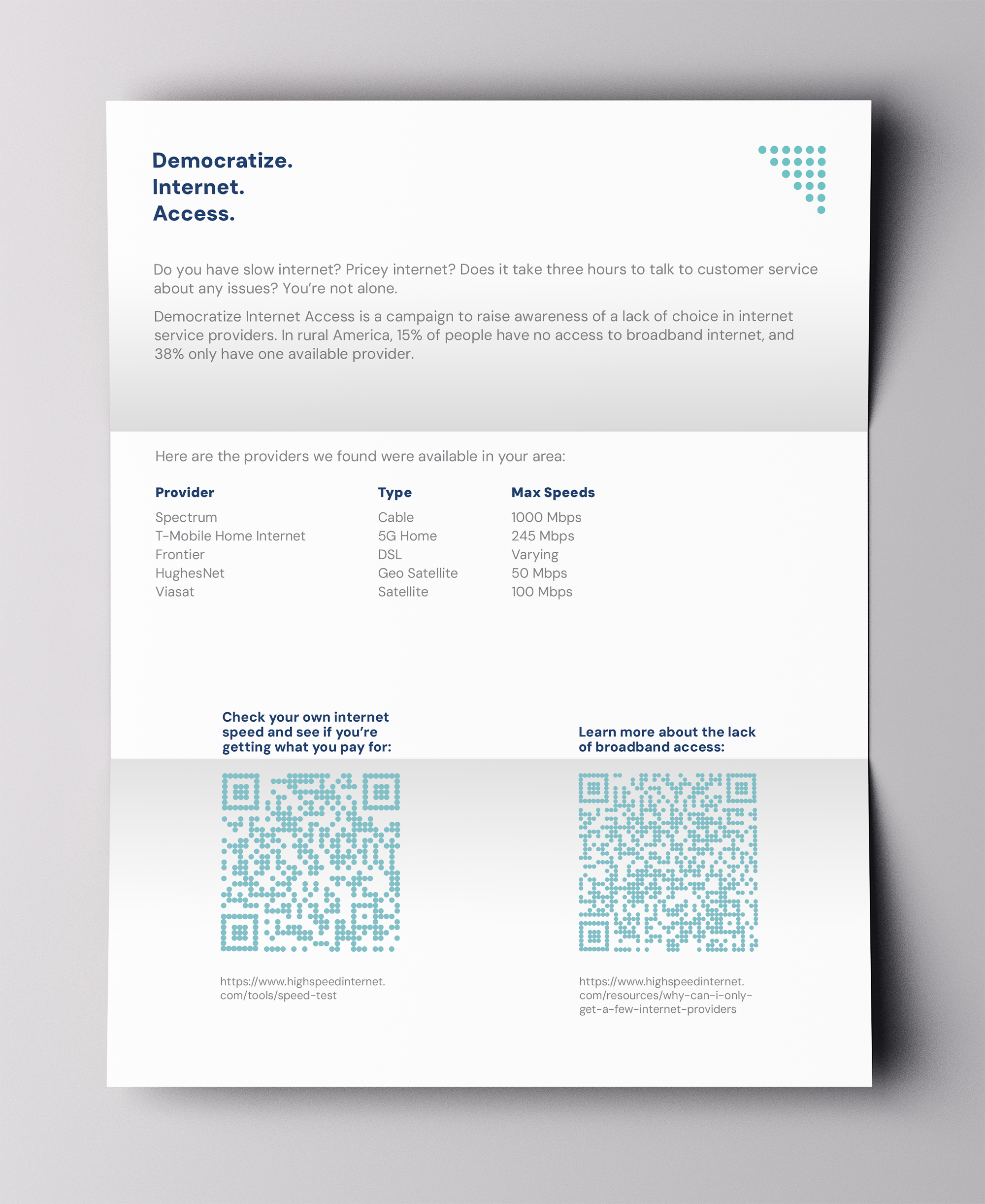 In this project, I created an animation and other campaign materials to inform citizens of the lack of choice in internet service providers, and the harm it causes.