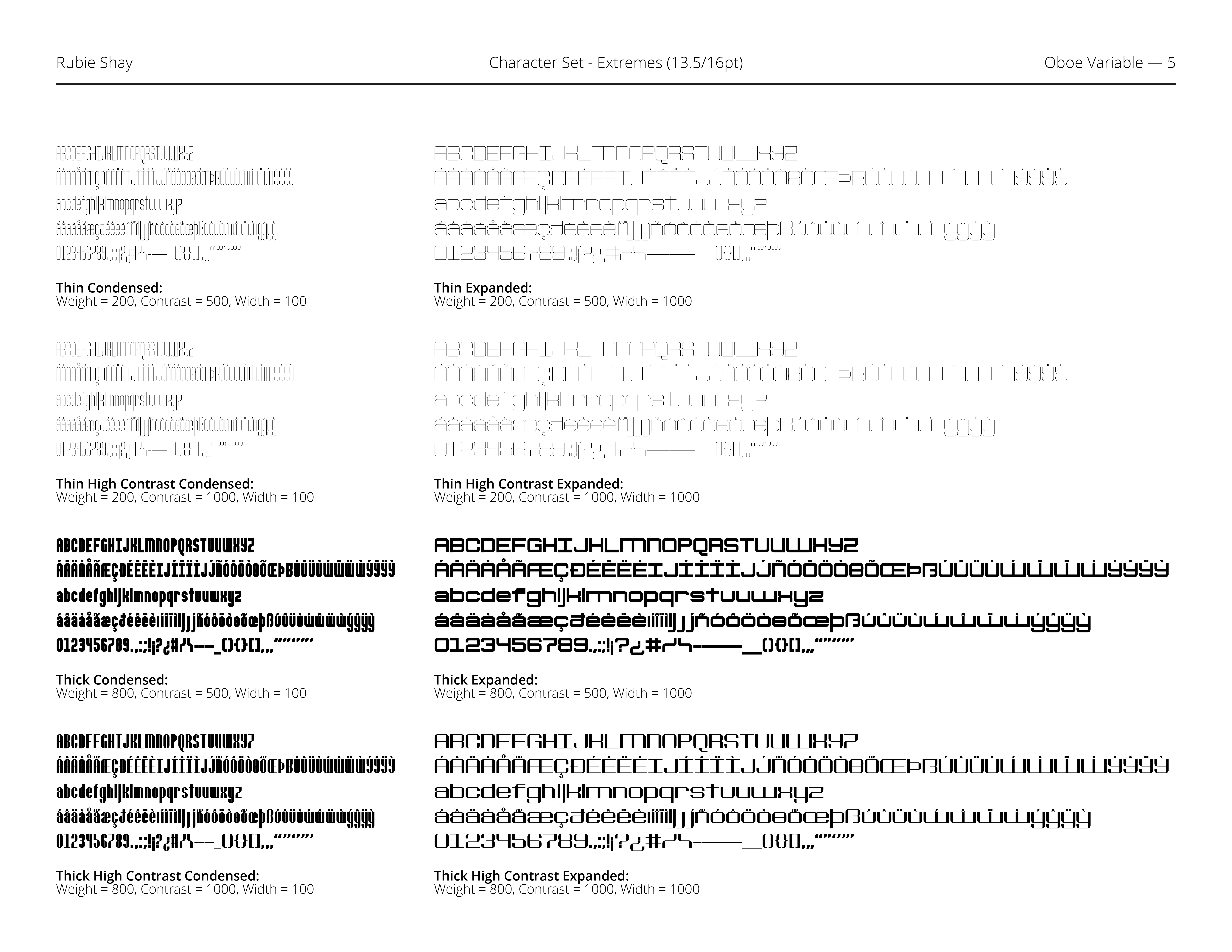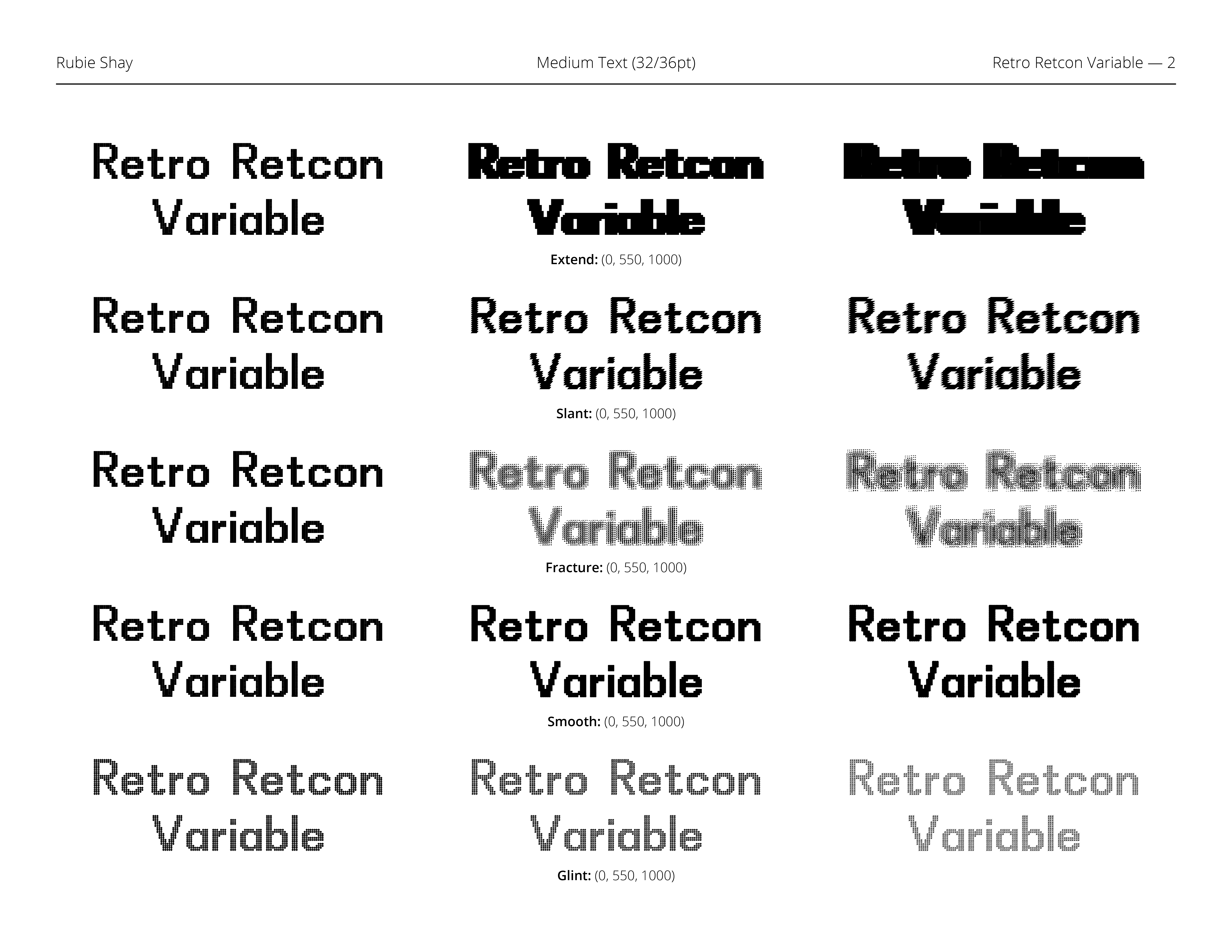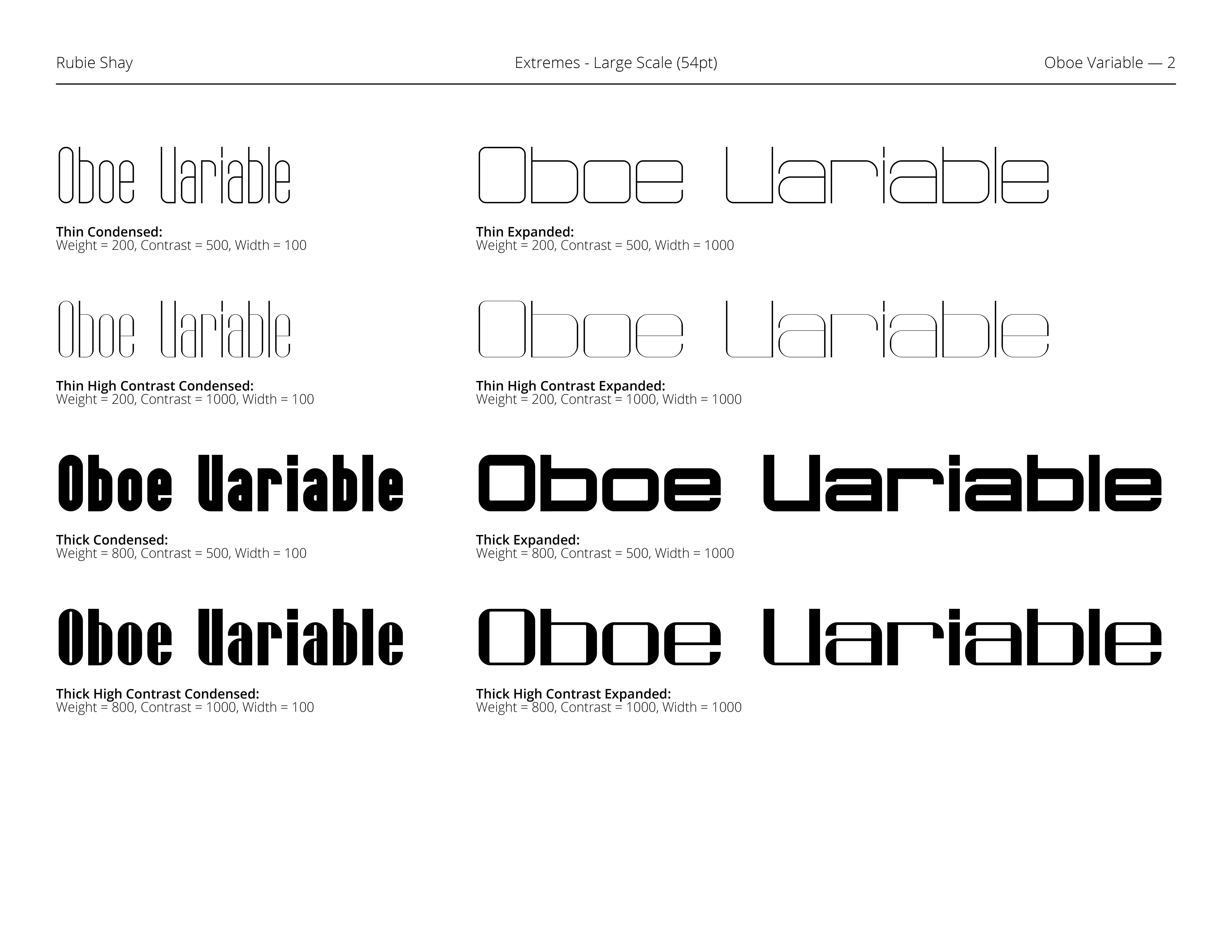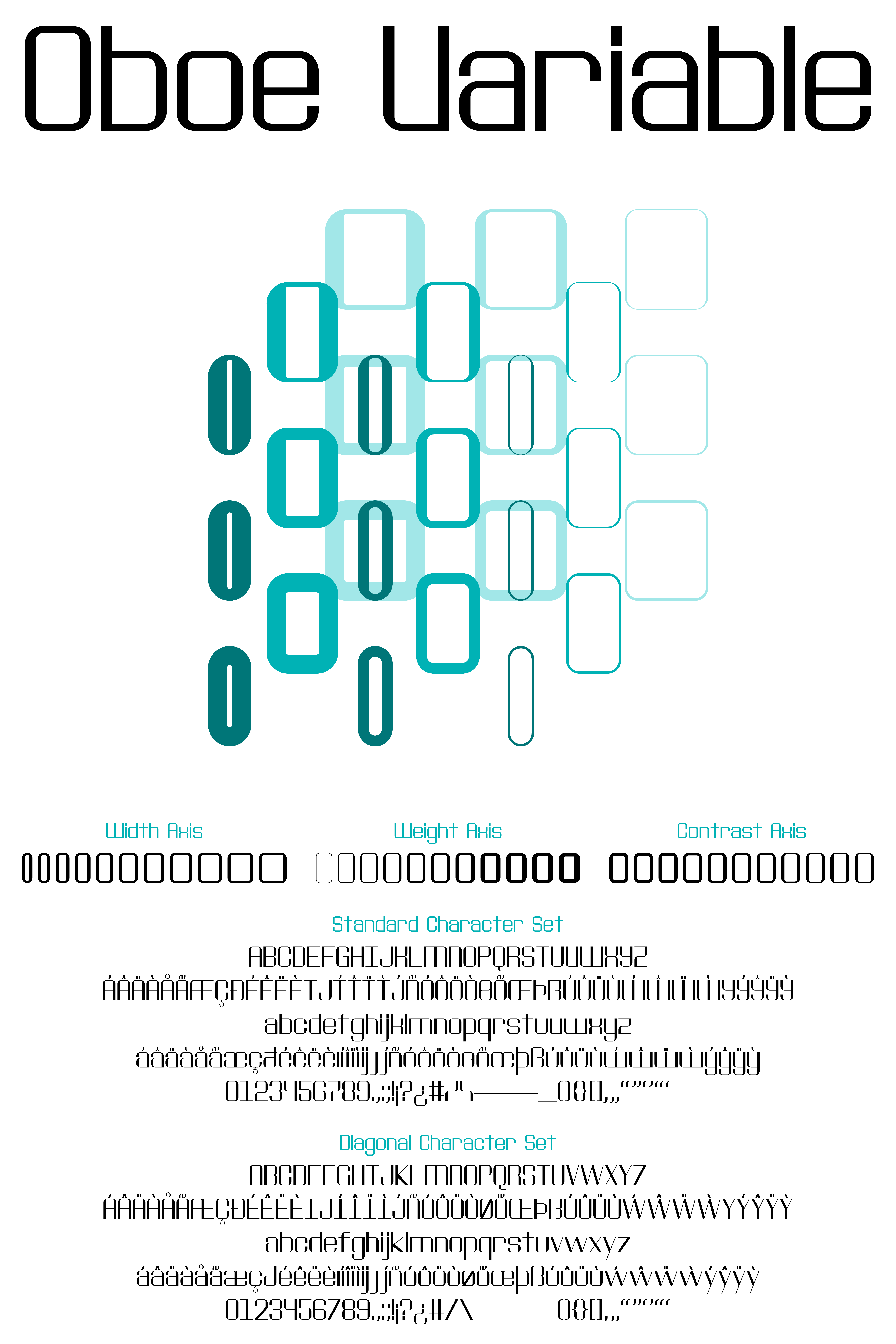 This geometric variable typeface has three axes (weight, width, and contrast), an alternate stylistic set, and some language support.