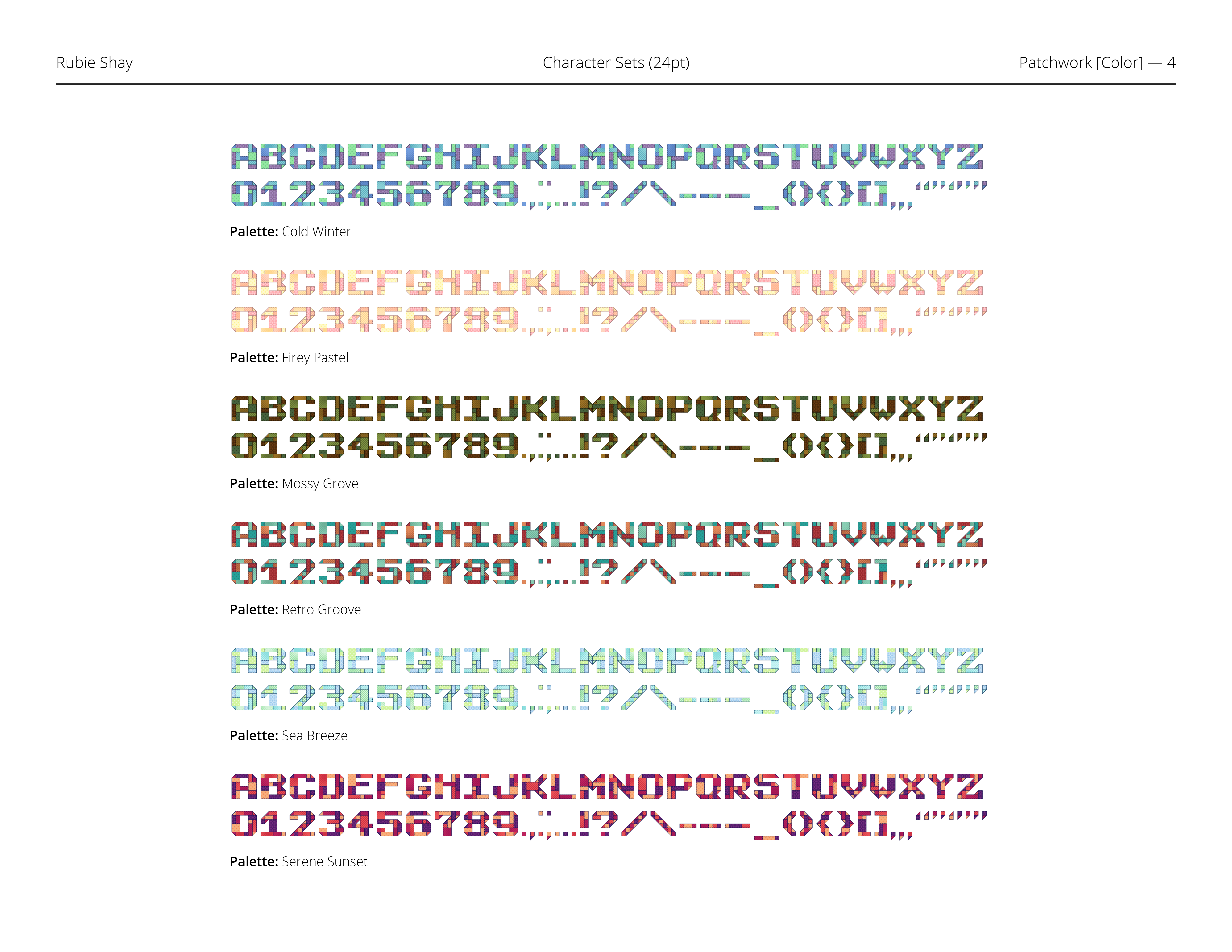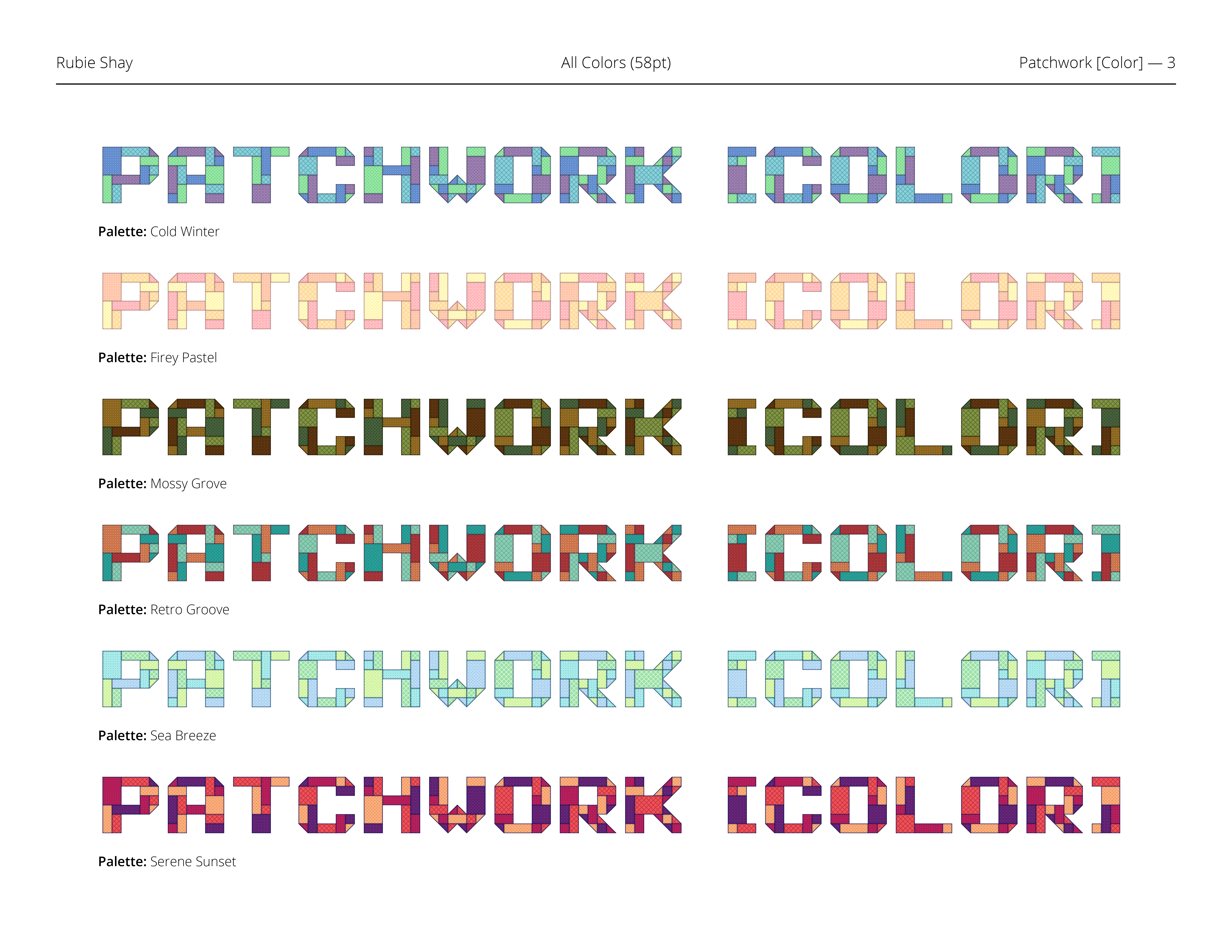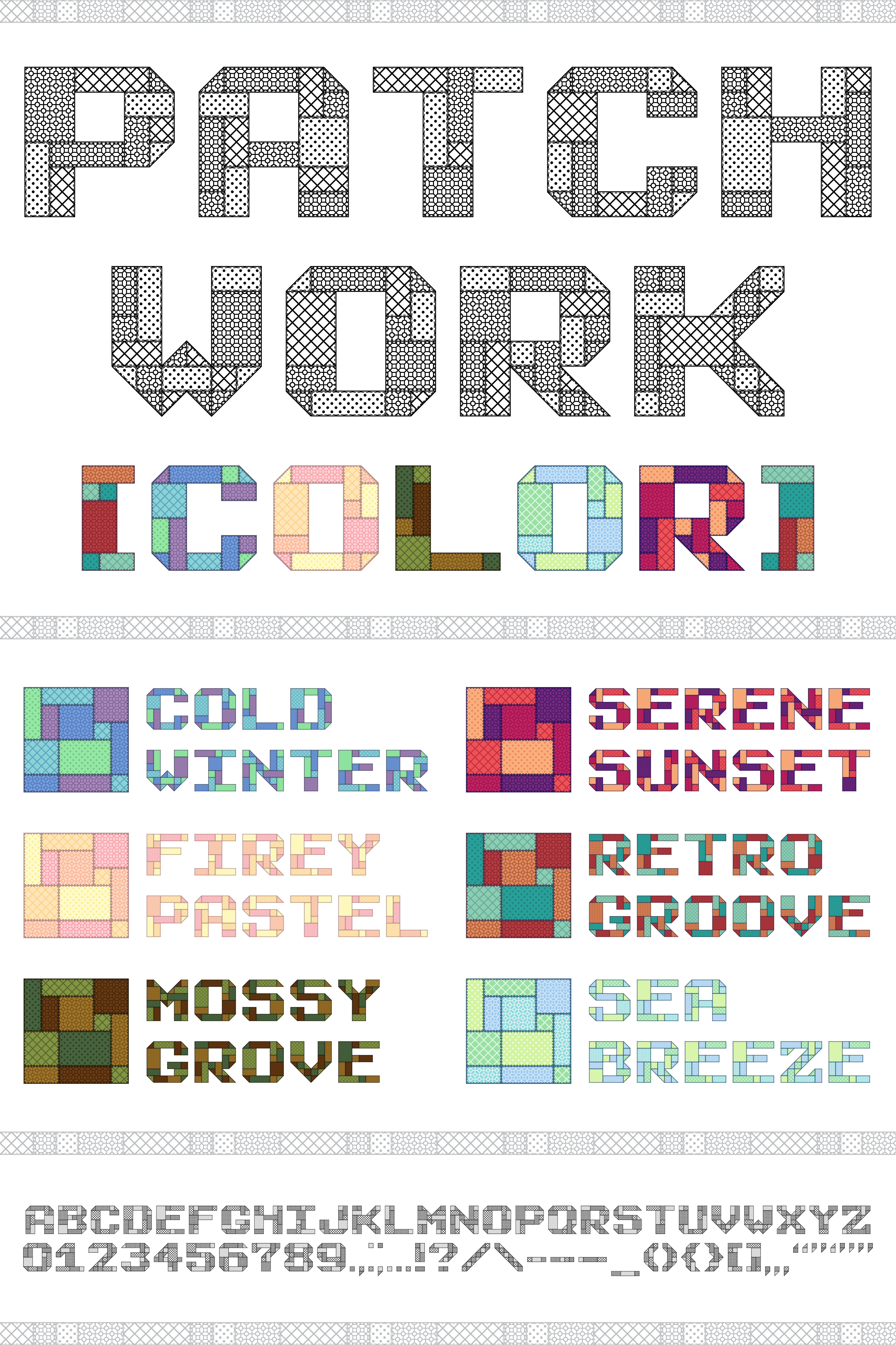 This color font was inspired by patchwork quilts, featuring four repeating patterns and six color variations.